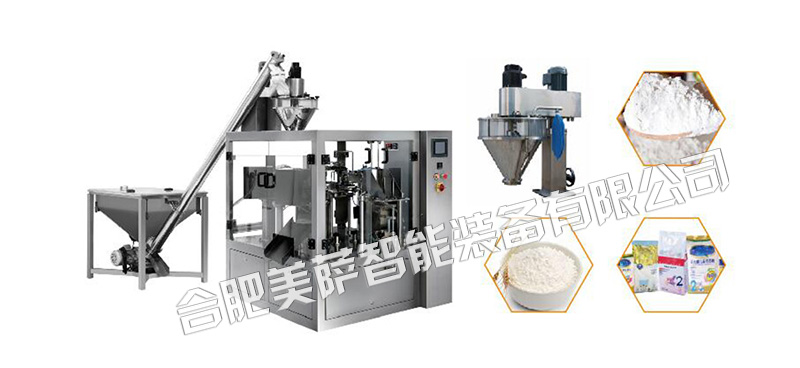MSA8系列给袋式包装机组,主要适用于100g-5000g,袋宽75mm-300mm,袋长100mm-450mm,适用背封袋,四边封袋,拉链袋,圆底袋,M袋等;运行速度: 25-60包/分钟,根据物料的特性而定。该新型包装机主要应用于食品,洗化等领域中各种粉状物料的自动计量与包装。