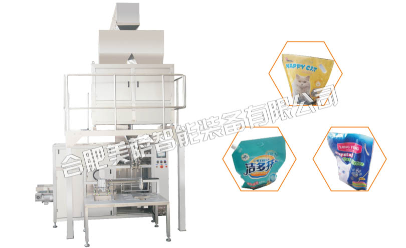 该包装机机组主要应用于食品、洗化、粮食等领域,适用于各种颗粒状、条块状的自动称量与包装。