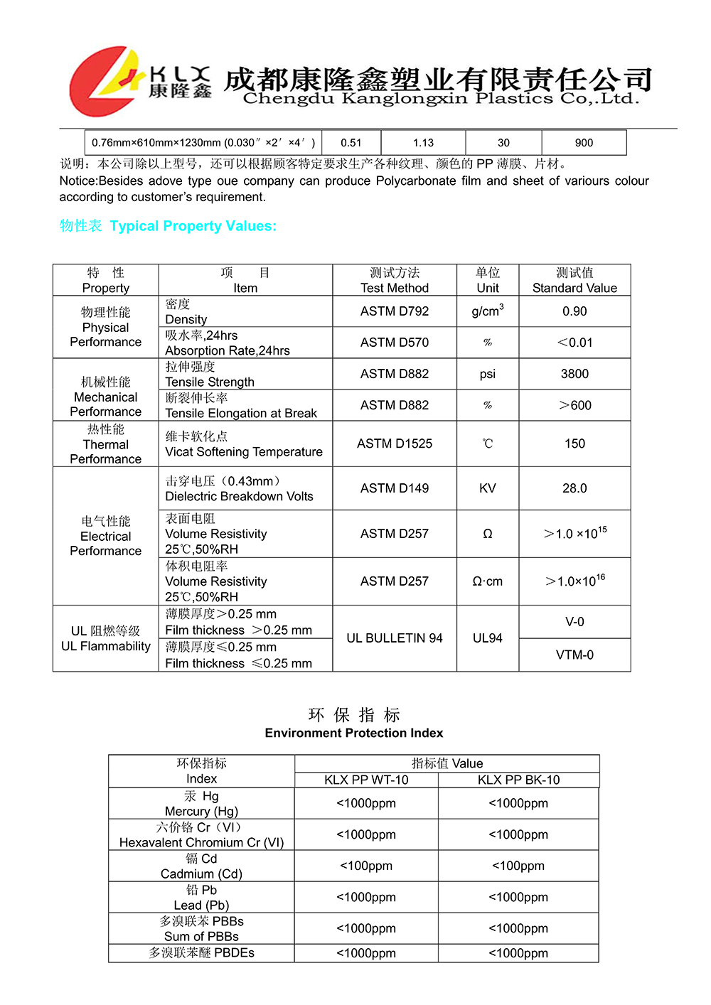 KLX PP WT/BK-10产品及性能资料
