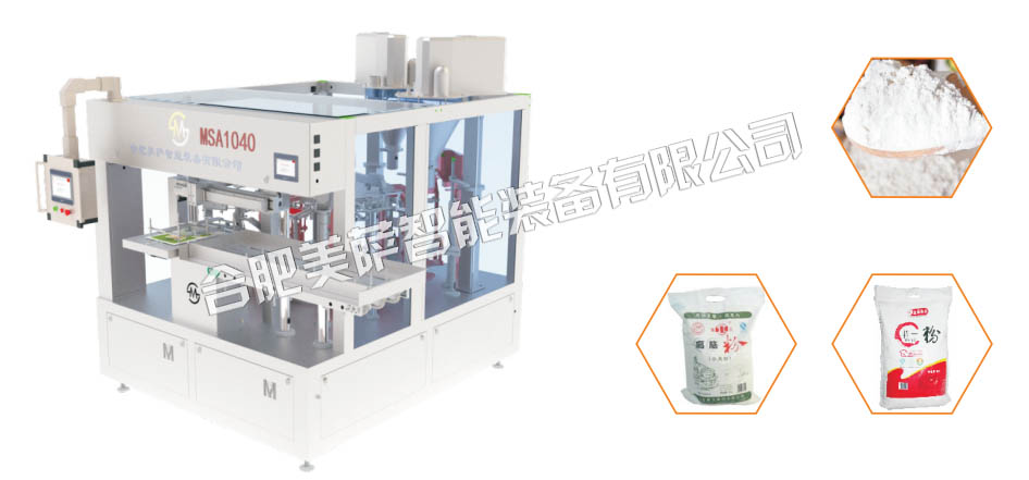 MSA1040双螺旋称重式包装机组,主机外形尺寸:2930mmX2240mmX2071mm(长×宽×高);适用袋宽:280mm-400mm 适用袋长:300mm-550mm;适用袋型:纺布袋;运行速度:5-20包/min(依据物料特性而定) ;包装重量:5-10kg.